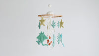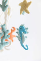 Experience the spectacle of ocean life where crabs, seahorses, and manta rays glide gracefully among starfish and coral. At the heart of this marine ballet is a magnificent jellyfish, floating serenely in the center. Our ocean life mobile enchants and soothes the baby into a peaceful slumber and gently stimulates their visual senses while awake.