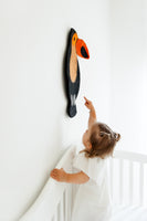Our Toucan Nursery Wall Hanging is 21 inches tall (height), 13 inches across (length), and 0.5 inch thick (width)