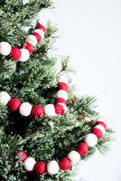 Close-up of a Christmas tree adorned with Nivass White + Red Ball Felt Garland, elegantly draped around its branches as part of the festive holiday decor.