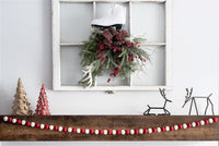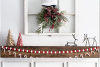Nivass White + Red Ball Felt Garland, paired with wooden trees, metal reindeer, and a window dressed in a plaid bow with greenery above, embodies the handmade charm of festive mantel decor.